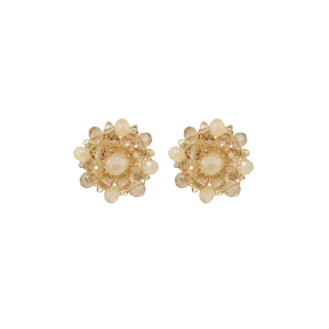 01 par de brincos em formato arredondado, bordado a mão com cristais em tons nude e folhado a ouro.