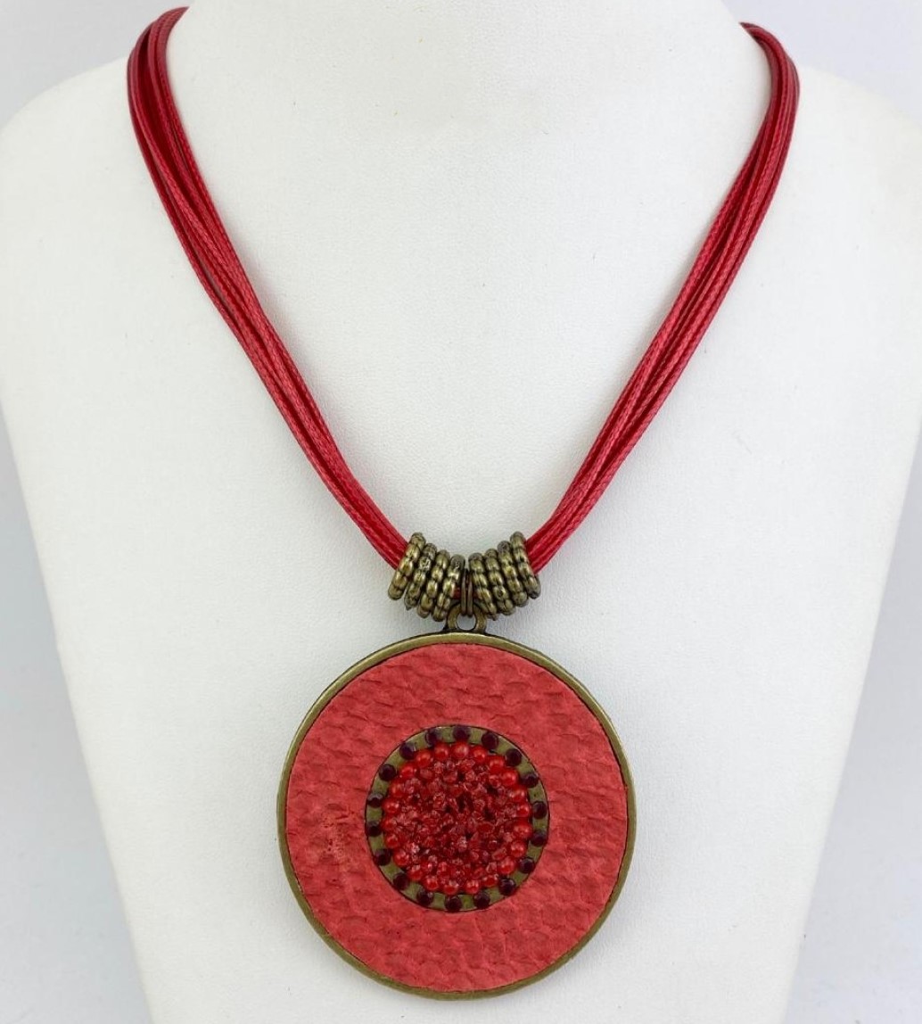 COLAR CURTO CORDÕES E MANDALA C/ COURO, CASCALHO E STRASS VERMELHO